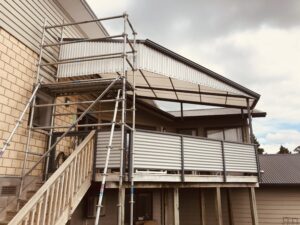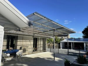 A tinted monopitch steel framed pergola was installed over these decks to create more useable outdoor space – away from the sun and the rain!